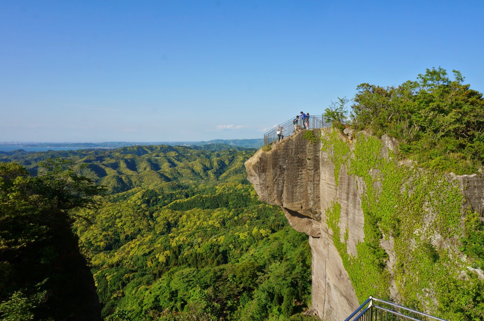 房総半島の西に聳え立つ鋸山は海抜329メートル。石を切り出した岩肌がまるで鋸の歯のようであることからそのように命名された。中でも「地獄のぞき」は房総半島を一望できる絶景スポット!そのほかにも日本一大きい石製の大仏や百尺観音など見どころが満載!